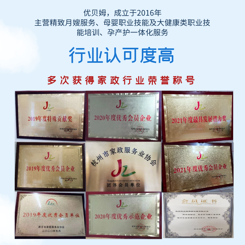 杭州優(yōu)貝姆健康管理有限公司,成立于2016年,是一家致力于打造集定制居家月嫂服務(wù)、孕產(chǎn)護(hù)一體化服務(wù)、母嬰健康管理培訓(xùn)學(xué)校為一體的現(xiàn)代化母嬰健康管理企業(yè)。 連續(xù)多年被浙江省家政協(xié)會及杭州市家政協(xié)會評為:“優(yōu)秀會員單位”“家政示范企業(yè)”“特殊貢獻(xiàn)獎”等殊榮。 多次在浙江省家政技能比賽中獲得優(yōu)異成績,并代表浙江省參加“長三角家政技能大賽”并取得優(yōu)異成績。